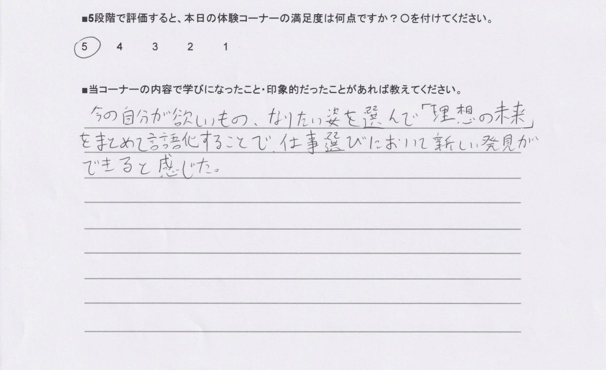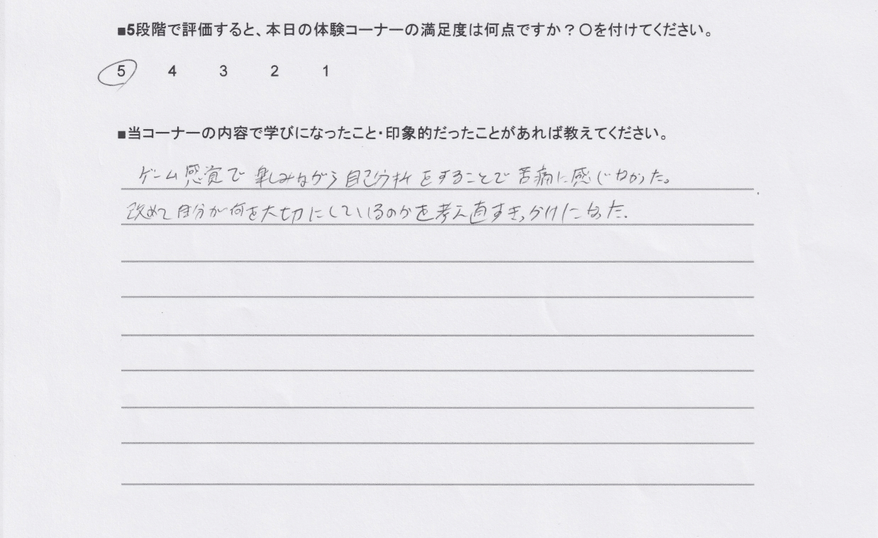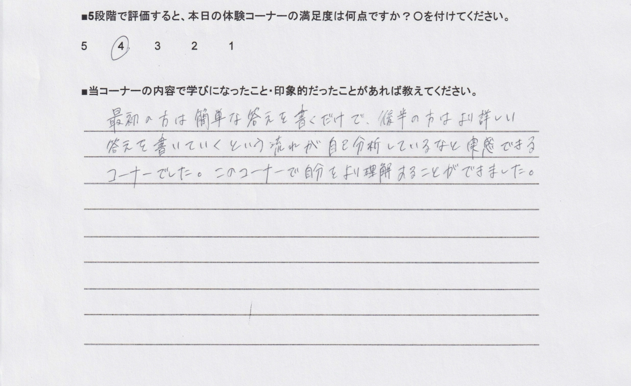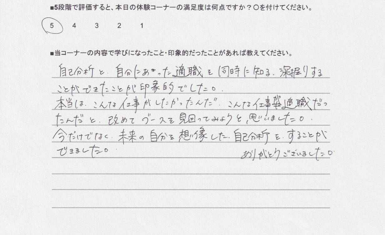 終了後の満足度アンケートでは、とっても嬉しいことに8割以上の方が「満足」(5段階中4以上の評価)とご回答いただき、非常に多くの方に「自己分析って楽しい!」「自分のことが知れてよかった」と感じていただけたようでした。