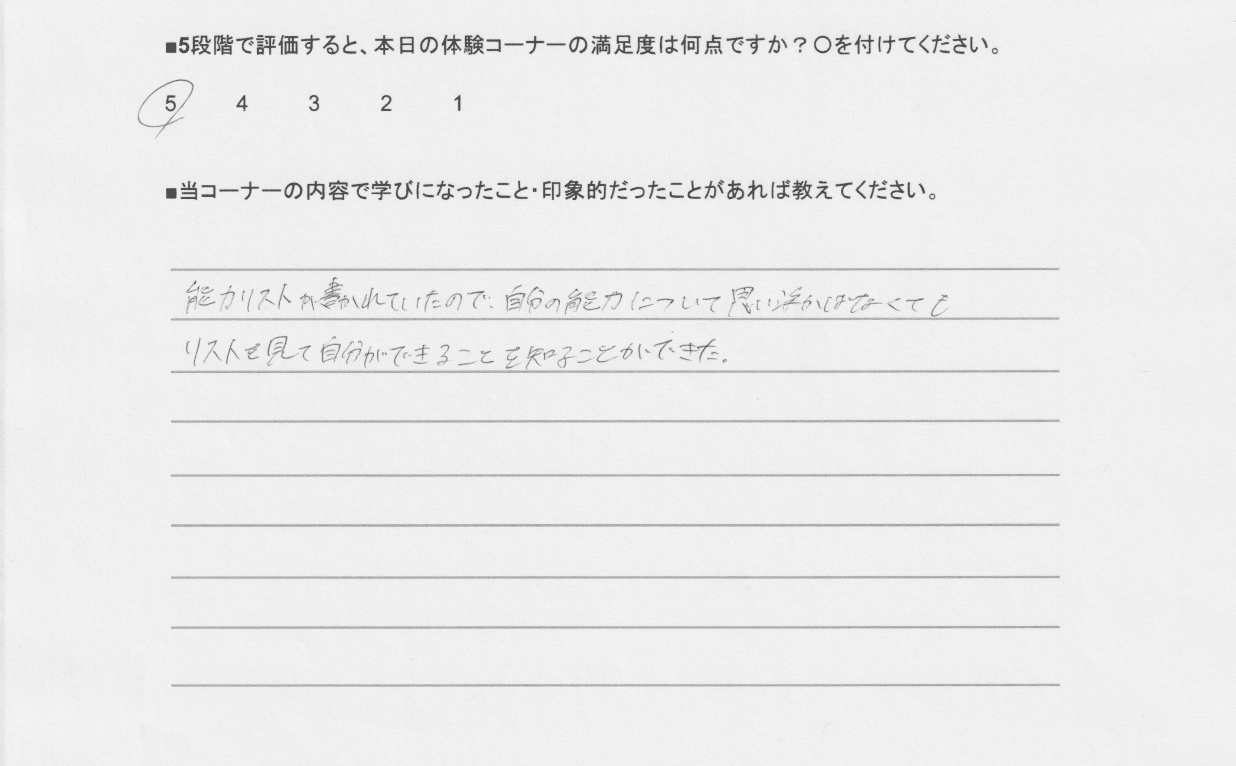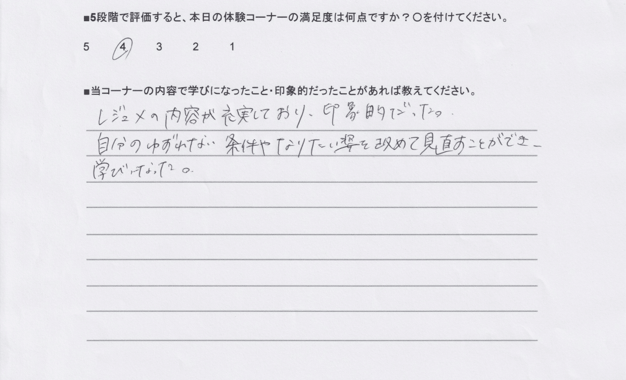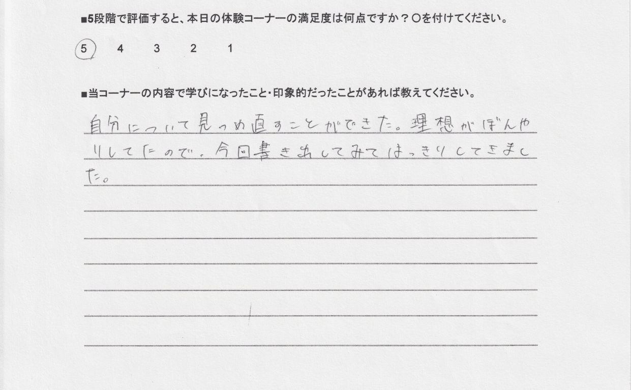 終了後の満足度アンケートでは、とっても嬉しいことに8割以上の方が「満足」(5段階中4以上の評価)とご回答いただき、非常に多くの方に「自己分析って楽しい!」「自分のことが知れてよかった」と感じていただけたようでした。